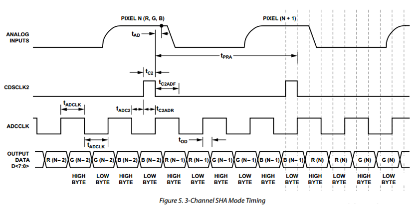 在3通道SHA模式下,AD9822同時(shí)采樣SIG1,SIG2和SIG3輸入電壓。采樣點(diǎn)由CDSCLK2控制。 CDSCLK2的下降沿對(duì)每個(gè)通道上的輸入波形進(jìn)行采樣[A1] 。來自三個(gè)SHA的輸出電壓由DAC修改,然后由三個(gè)PGA縮放。然后PGA的輸出通過14位ADC多路復(fù)用。 ADC在ADCCLK的下降沿順序采樣PGA輸出。